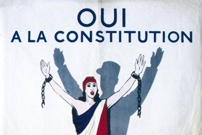 | Détail de l'affiche du Comité ouvrier et professionnel pour le soutien à l'action du général De Gaulle (1958), en faveur du "Oui" au référendum pour la nouvelle constitution française proposée par De Gaulle. |